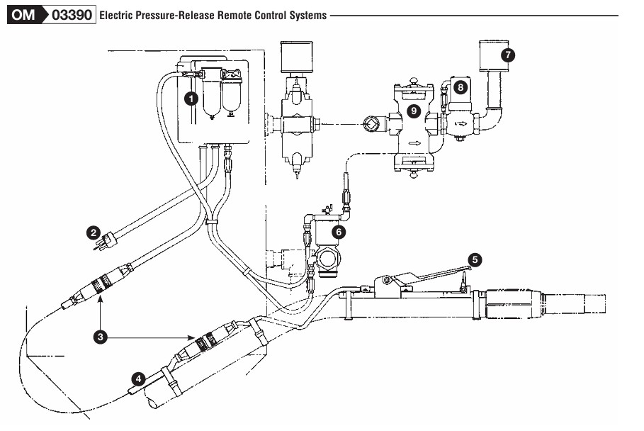 This system provides the operator with start/stop control at the nozzle and allows the blast machine to depressurize, for refilling, each time the control handle is released.