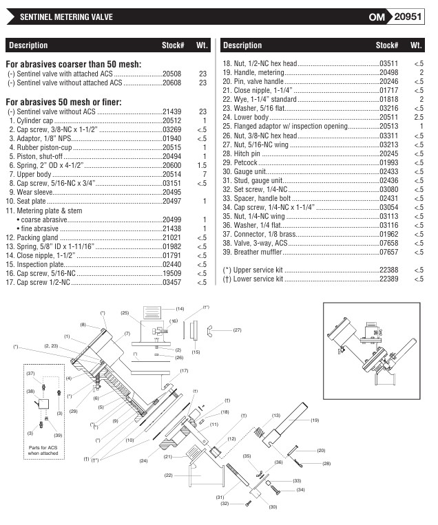 The Sentinel Metering Valve (with ACS) is a pneumatically-operated abrasive media valve with an Automatic Cutoff Switch. This valve is well-suited for all common blast media coarser than 50 mesh. The sentinel is compatible on classic blast machines 2 cuft and larger equipped with a pressure release remote (either pneumatic or electric). This valve requires 50-70 PSI to fully open the plunger. This abrasive metering valve has a 1-1/2" NPT connection to the pot.