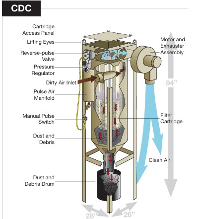 Simple Cartridge Maintenance – CDF Dust Collectors have tool-less filter cartridge changeout and easy horizontal cartridge access. Horizontal access also saves floorspace because of its vertical stacking.