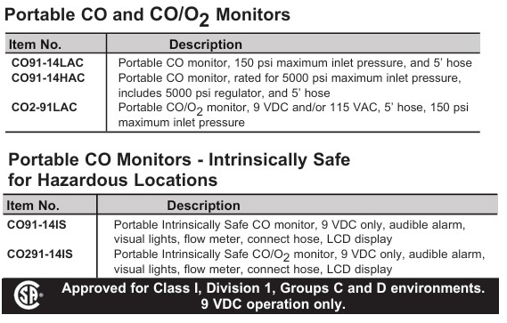 A portable airline monitor connects easily to a breathing air filtration source or ambient air pumps and monitors the air for CO or CO/O2, depending on the model. An audible alarm (95 dBA) and light will activate when the CO level exceeds 10 ppm (5 ppm Canadian). Used in the closed and upright position, an external alarm and lights signal the user if there are dangerous CO or CO/O2 levels.
