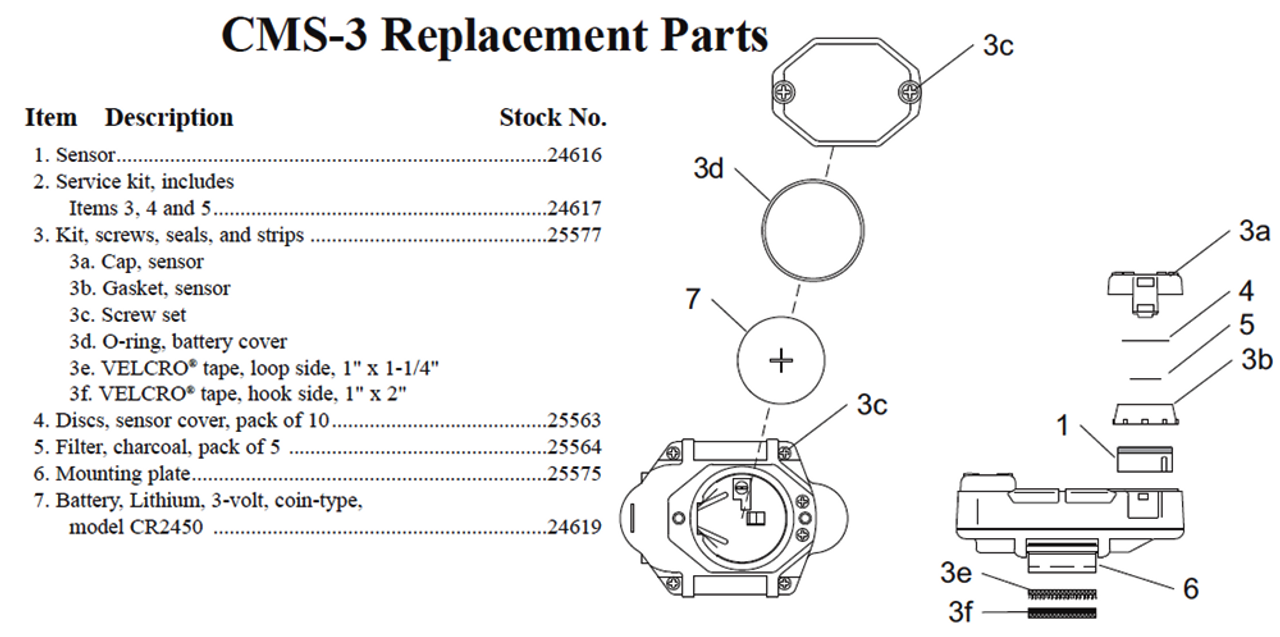 The CMS-3 is a field, in-helmet, CO monitor/alarm for air respirators and can be moved from helmet to helmet. Connector and test gas are not included with this monitor.