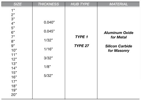 Premium Cut Off Wheels available in Type 1 and Type 27. If you do not see your size or material, please contact us with your specific needs.
