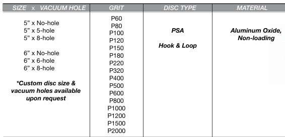 PSA and Hook & Loop discs are available with C-wt PAPER BACKING, FILM BACKING and CLOTH BACKING. This product is designed to apply on metal, wood, paint, primer and other finishes. Read chart below to learn available materials and grits. If you do not see your size or material, please contact us with your specific needs.