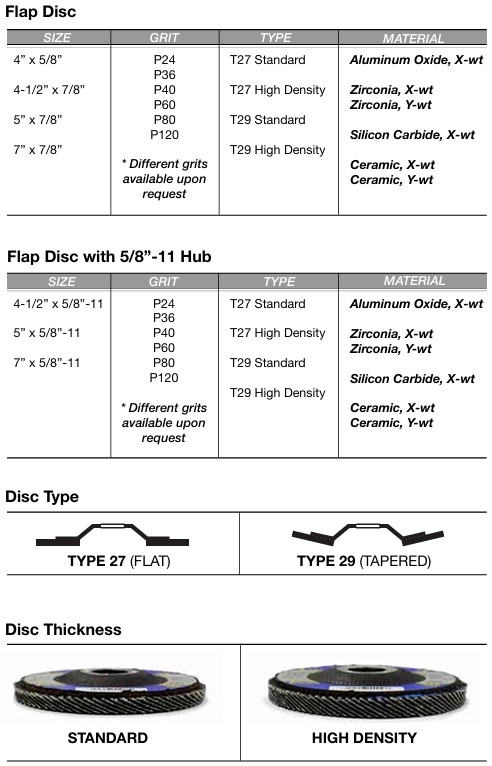 Standard & High Density Flap Discs available in Type 27 and Type 29, with and without hub. Flap Discs can provide extended life over resin fiber discs because of the layered construction. If you do not see your size or material, please contact us with your specific needs.