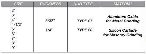 PremiumGrinding Wheels available in Type 27 and Type 28. If you do not see your size or material, please contact us with your specific needs.