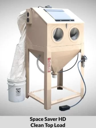 Among the standard features, the Space Saver HD comes standard with a Class III 335 cfm pressure blower and patented centrifugal abrasive separator reclaimer. The reclaimer is used to remove dust and spent abrasive from the cabinet which vastly increases visibility. The *patented separator reclaimer is one of the most important items on any blast cabinet. This sand blasting cabinet also includes the tubular dust bag with dust collection pail. This Mediablaster® is primarily used for glass bead blasting.
